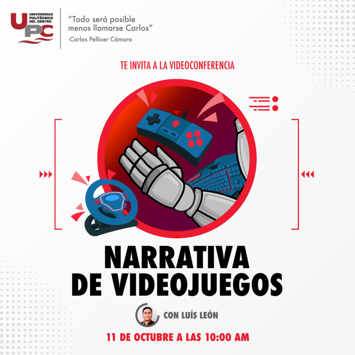 Plática dada para la Universidad Politécnica del Centro de Tabasco con la intención de orientarlos con respecto al área de diseño y narrativa para videojuegos. (No disponible para ver).